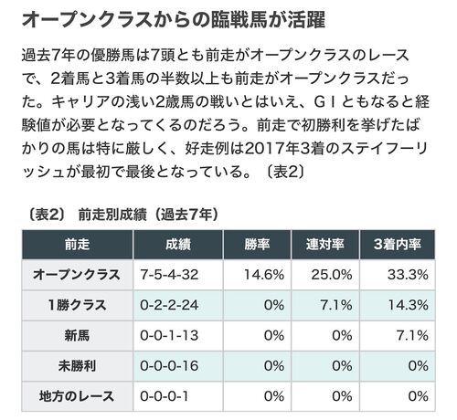ホープフルS分析 ①前走の格 [例外 1勝クラス/新馬] 2017 3着 ステイフーリッシュ 新馬2000m1着 2018 2着 アドマイヤジャスタ 紫菊賞2000m1着 2020 3着 ヨーホーレイク 紫菊賞2000m1着 2021 2着 ジャスティンパレス 黄菊賞2000m1着 2022 3着 キングズレイン …